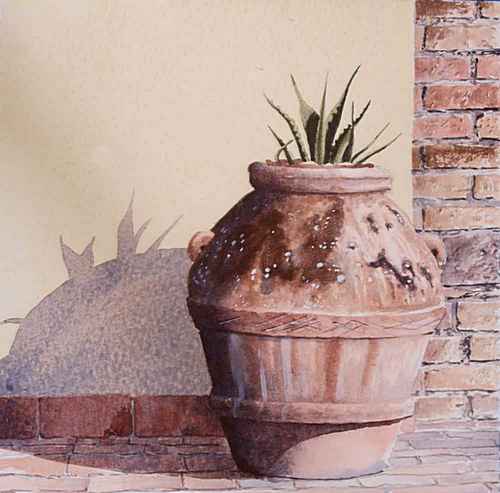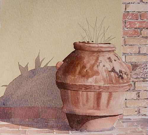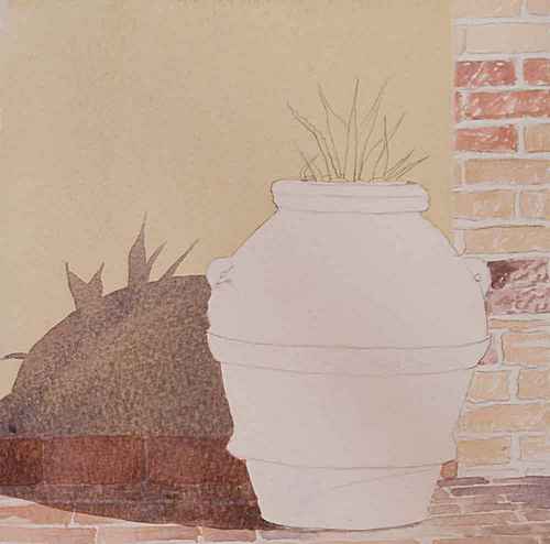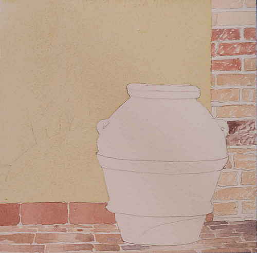 This large urn can be found in the courtyard in Moricci, Tuscany. To succeed with this exercise, you will need white paint. I know that this is a color that is not usually included in a watercolorist’s palette, but for this painting it is necessary. If you are going to use white paint to cover previously painted areas, it should be as opaque as possible. For this purpose, I recommend that you skip watercolor whites and instead use gouache, which is an opaque watercolor. The common Chinese white is transparent, and the same goes for zinc white. For maximum covering power, use titanium white, preferably in gouache.
